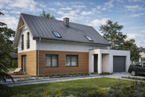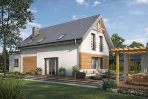 Bryła budynku jest zwarta i czytelna, a jej charakter podkreślają kontrastujące materiały elewacyjne – jasny tynk zestawiony z okładziną drewnianą. Takie rozwiązanie nadaje budynkowi elegancji, a jednocześnie przytulności i domowego charakteru. Dach pokryty blachą na rąbek stojący podkreśla nowoczesny styl i zapewnia trwałość na lata.