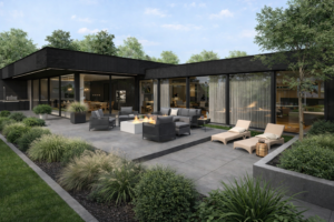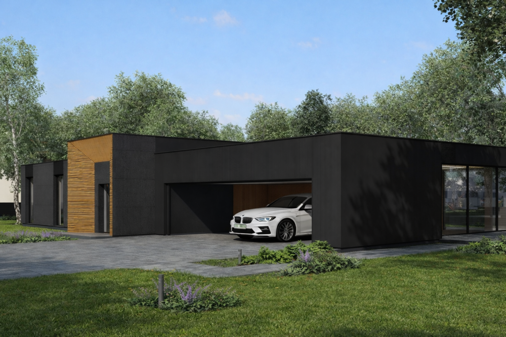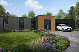 Prezentowany projekt to nowoczesny dom parterowy z dachem płaskim, zaprojektowany z myślą o komforcie codziennego życia, pracy oraz wyraźnym podziale stref funkcjonalnych. Minimalistyczna bryła, duże przeszklenia i stonowana kolorystyka elewacji nadają budynkowi ponadczasowy, elegancki charakter.